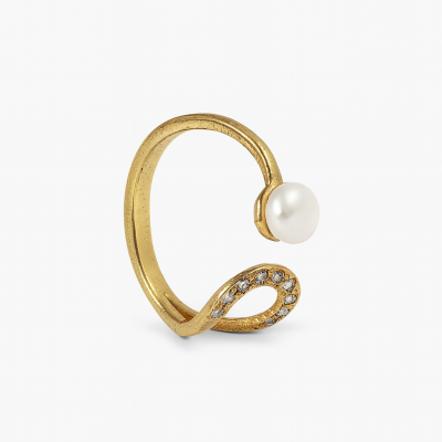 Anel ajustável com design moderno e elegante, destacando uma pérola central envolta por detalhes texturizados dourados. Sofisticado e versátil, é o toque perfeito para um visual contemporâneo.