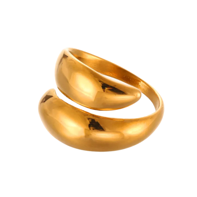 Anel moderno em acabamento dourado polido, com design aberto e curvas esculturais que abraçam o dedo com sofisticação. Uma peça de impacto, ideal para quem gosta de acessórios ousados e elegantes.