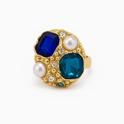 O Anel Ocean combina cristais azuis e pérolas com acabamento dourado, evocando o brilho e a profundidade do mar. Uma peça escultural que eleva qualquer look.
