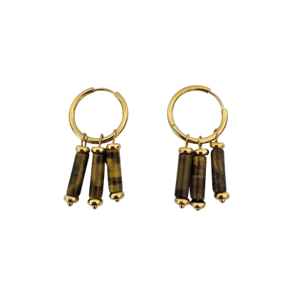 Brincos de argola em aço dourado com pendentes de pedras naturais em tons terrosos. Uma peça moderna e sofisticada que transmite força e elegância, perfeita para completar qualquer look.