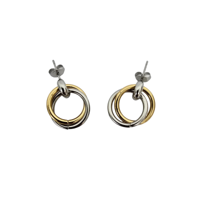 Brincos modernos em aço com duas argolas entrelaçadas em tons dourado, prateado. Um design contemporâneo que combina com qualquer look e acrescenta um toque de sofisticação.
