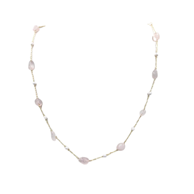Colar delicado e feminino, composto por pequenas contas de quartzo rosa intercaladas com pérolas irregulares, criando uma peça leve e sofisticada para o dia a dia ou ocasiões especiais.