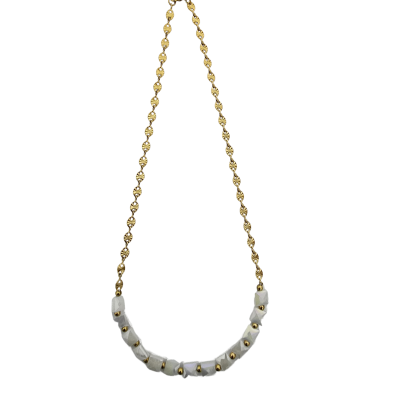 Colar elegante com corrente dourada trabalhada e detalhes em pedras brancas facetadas. Uma peça leve e sofisticada que combina facilmente com looks do dia e da noite.
