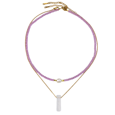 Colar duplo em aço dourado, composto por uma camada de contas lilás facetadas com detalhe de pérola central e uma corrente fina com pendente branco alongado. Uma peça elegante que alia frescura e sofisticação.
