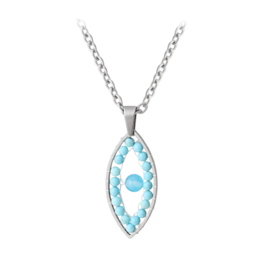 Colar em aço prateado com pingente em forma de olho estilizado, adornado com pequenas contas em azul turquesa e detalhe central em tom sólido. Uma peça moderna e cheia de simbolismo, ideal para realçar qualquer look.