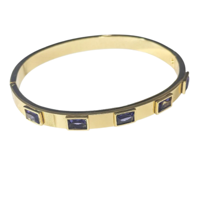 Pulseira rígida dourada, adornada com cristais retangulares em tom roxo. Uma peça sofisticada e moderna que combina luxo discreto e estilo contemporâneo.