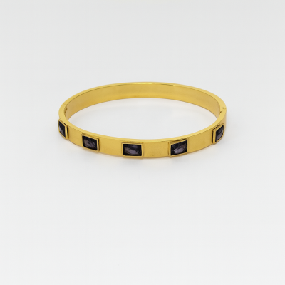 Pulseira rígida em aço dourado com cristais retangulares escuros embutidos, criando um contraste elegante e contemporâneo. Um acessório sofisticado que eleva qualquer look com brilho e personalidade.