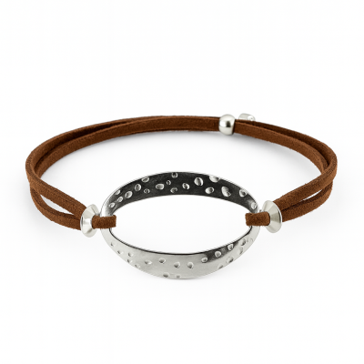 Pulseira ajustável com detalhe oval em aço prateado texturizado e fita castanha em camurça. Um acessório com um toque artesanal e elegante, perfeito para um estilo descontraído e sofisticado.