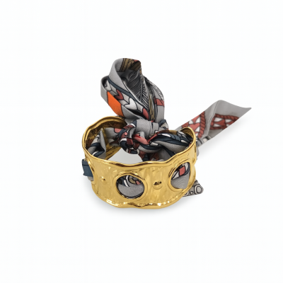 A Pulseira Silk Gold combina o brilho intenso do dourado com a suavidade de um lenço em seda estampada. Uma peça versátil e elegante que une estilo contemporâneo e toque artístico.
